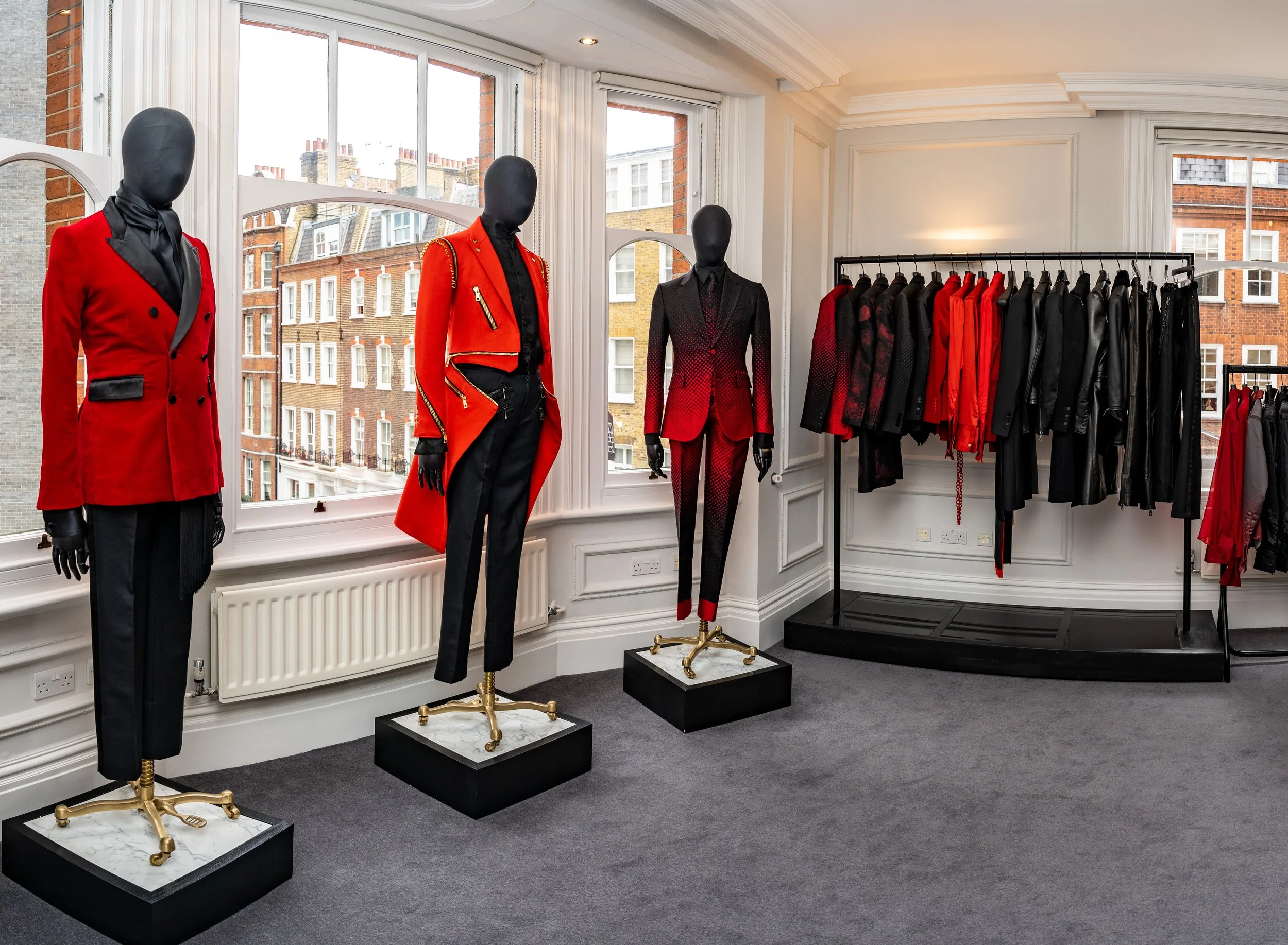 The Joshua Kane London Showroom is situated in the heart of Marylebone W1. All fittings and showroom appointments take place on the second floor of 47B Welbeck St. A prior appointment is required within the hours of 10am - 5pm from Monday to Saturday to view our current collections of men’s, women’s Made-To-Measure tailoring and Ready-To-Wear accessories. The showroom also plays host to a number of designs featured in our couture collection alongside some exhibition pieces created for celebrity performances and red carpets.